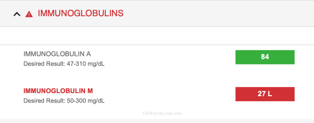Lyme disease is a bacterial infection. While that sounds obvious if you’ve known it for a while, I did NOT know it for many years. I first heard about Lyme disease when I visited family in upstate New York as a child. Many years later, definitely well into adulthood, I learned that it’s a bacterial infection. So, if immunoglobulins fight bacteria, then having a low level of them is really bad, especially if you’re dealing with Lyme disease. My doctor told me that one of his main long-term concerns is my IgM level, and now I better understand why.